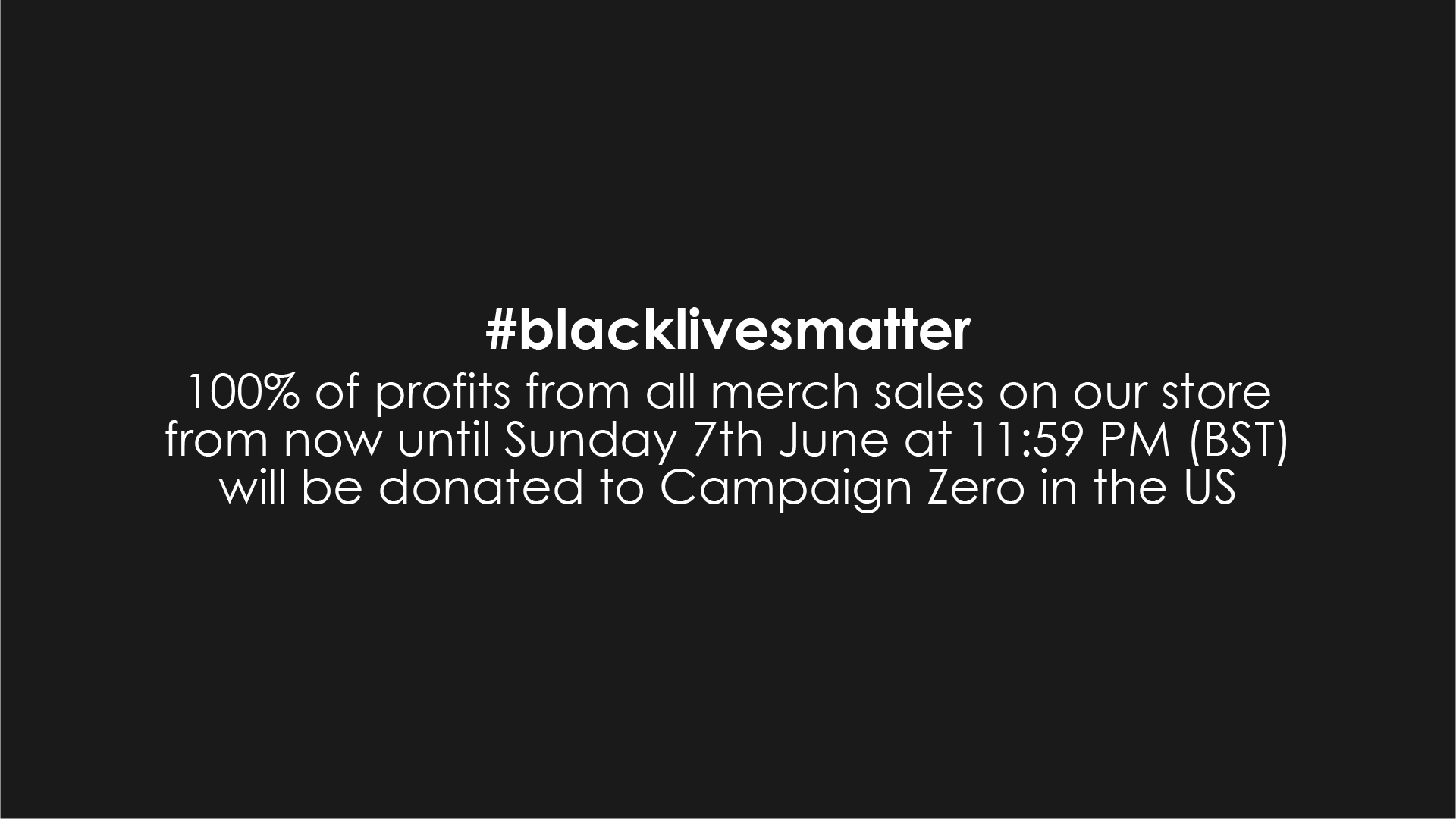 100% of profits from all merch sales on our store from now until Sunday 7th June at 11:59 PM (BST) will be donated to Campaign Zero in the US. We will also be making our own donation to Campaign Zero too.